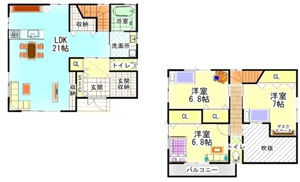1F LDK 21.0帖 、2F 洋 7.0帖 、2F 洋 6.8帖